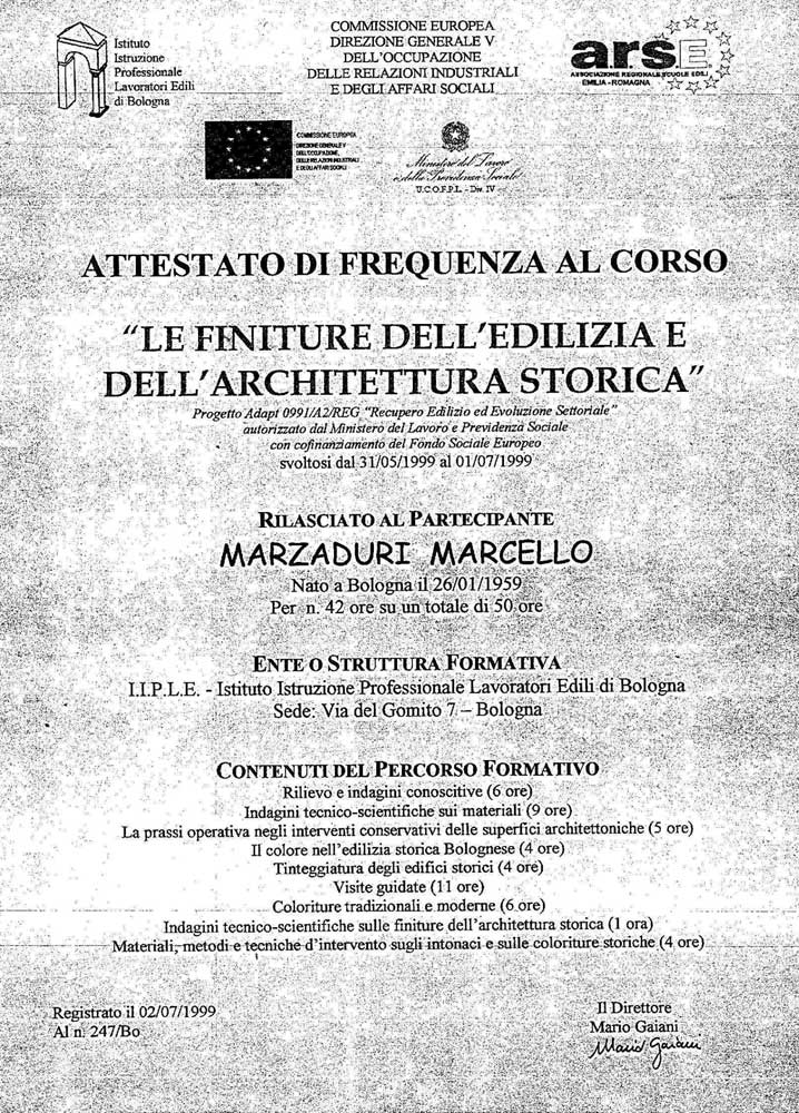> Corso di aggiornamento professionale per “Le finiture dell’edilizia e dell’architettura storica", presso l’I.P.L.E. di Bologna ed autorizzato dal Ministero del Lavoro e Prev. Soc.